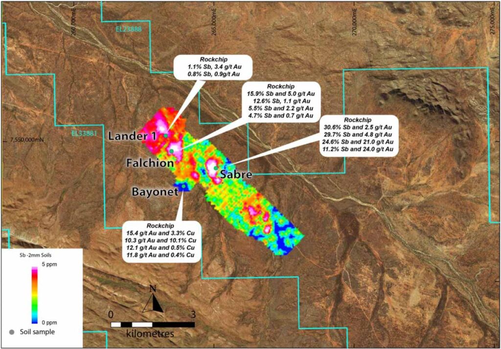 - Prominent soil anomalies are well defined at Sabre, Falchion and Lander and are supported by recent high-grade antimony and gold rock chips at each prospect